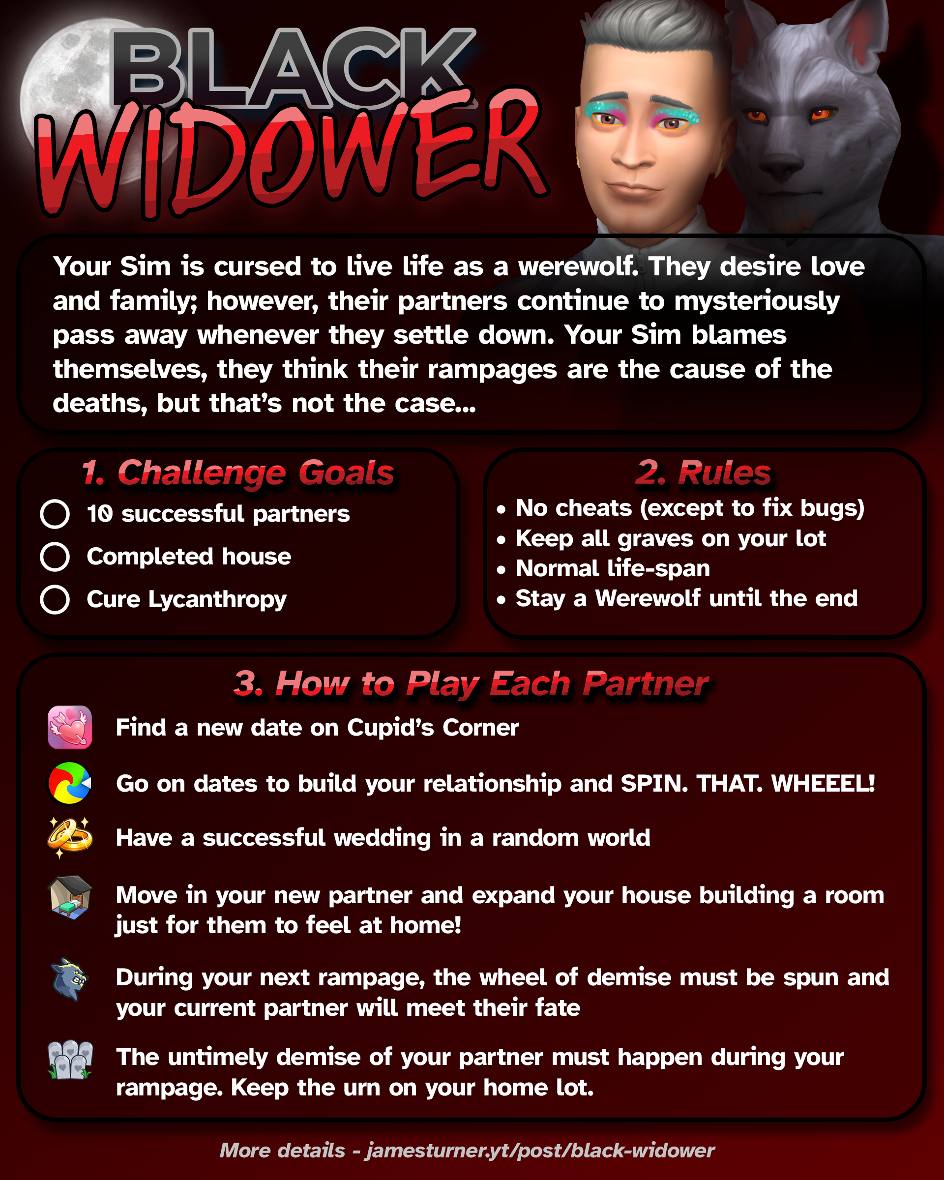 My version of the Black Widow challenge is based upon the post on the Sims Challenges Wiki, which in turn references this post by LampreM.