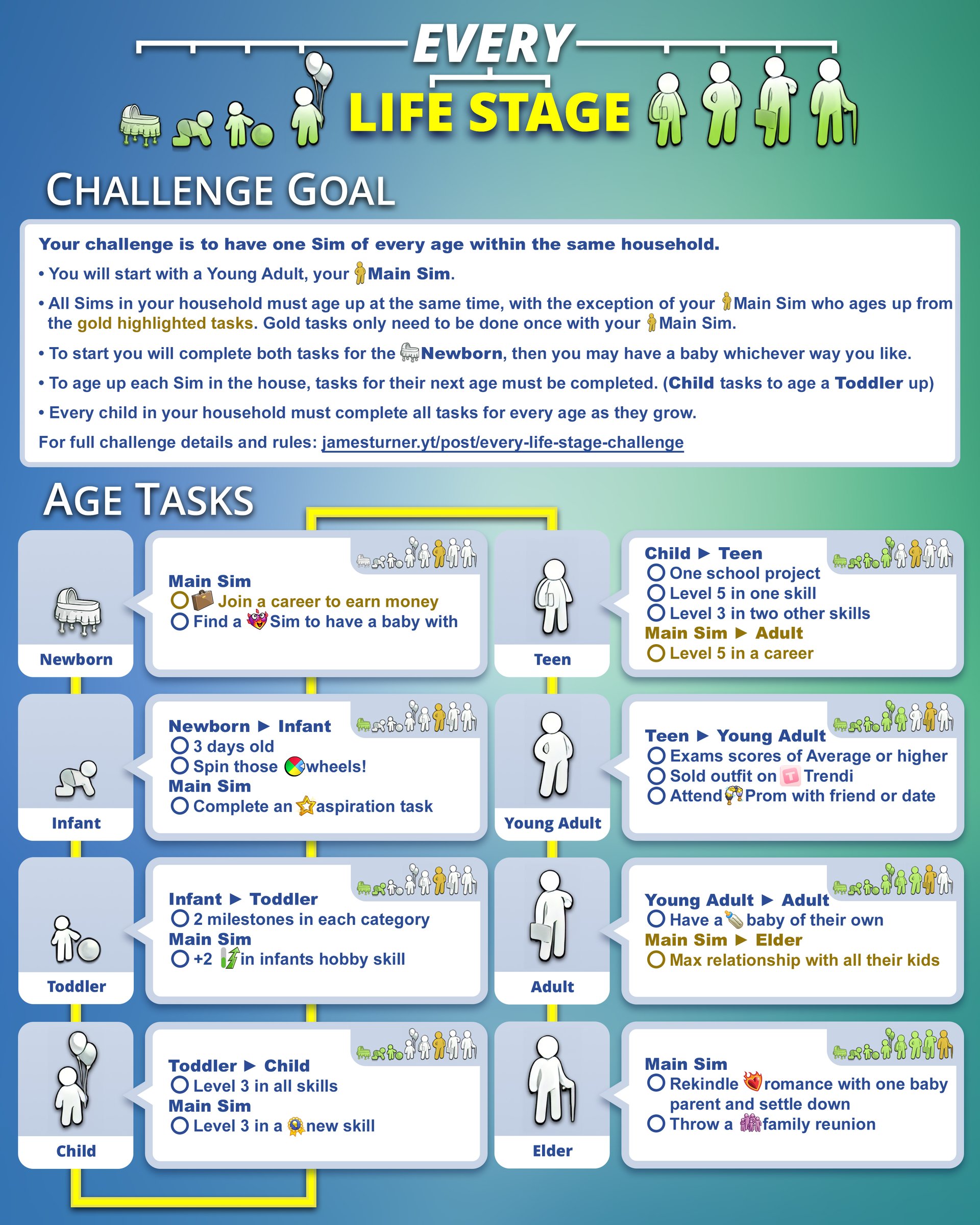 Main Sim who ages up from the gold highlighted tasks. Gold tasks only need to be done once with your